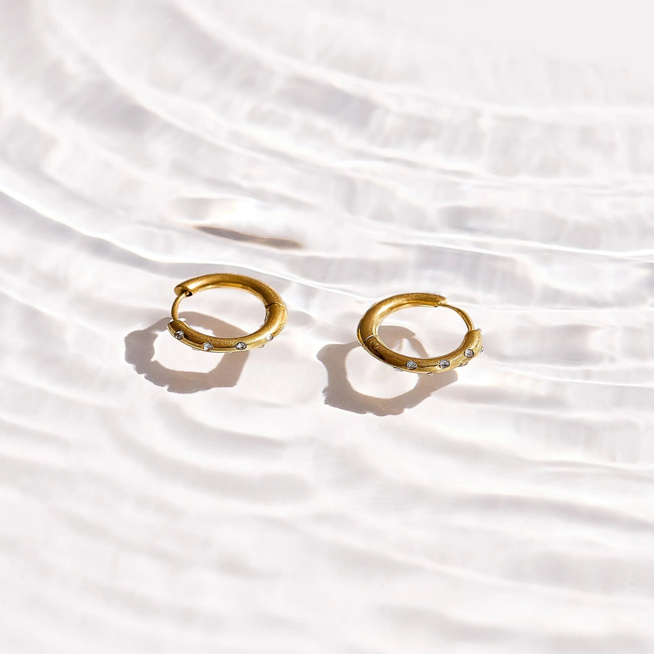 These hoops feature a polished rounded shape scattered with delicate crystal dots for a playful touch of sparkle. Lightweight and full of shine, they’re the perfect balance of bold and sweet—ideal for elevating your everyday ear stack.