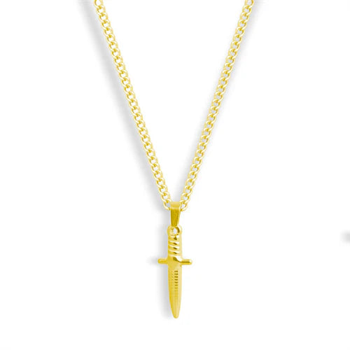 Unleash your inner warrior with our Dagger Necklace. Crafted with a sleek curb chain, this necklace features a fierce dagger pendant, perfect for men who want to make a bold statement. Get ready to turn heads and exude confidence wherever you go with this edgy accessory.