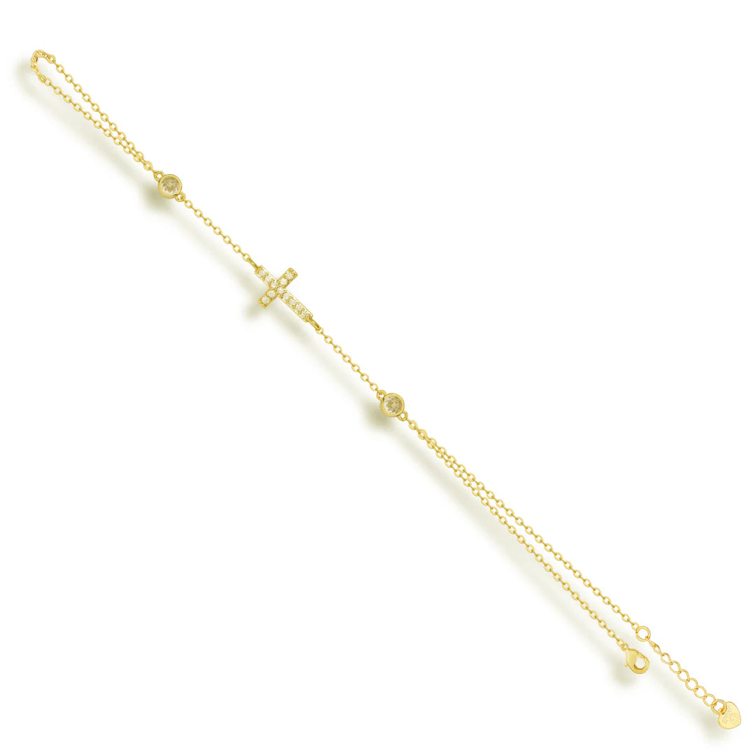 Elevate your style with our Don't Cross Me Hand Chain! This exquisite hand chain features a dazzling pavé cross and two bezel stones, adding a touch of elegance and edge to any outfit. Accessorize with confidence and make a statement with this must-have piece.