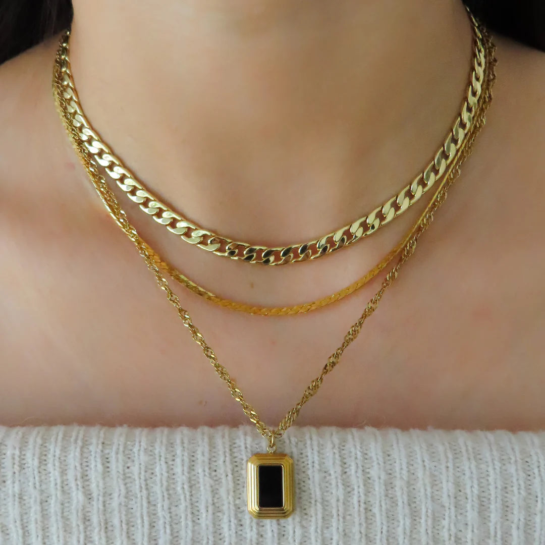 Accentuate your style with the adorable Eden Necklace. This cute necklace features a Singapore chain and rectangular pendant, adorned with a stunning black stone. Embrace its unique design and stand out from the crowd.