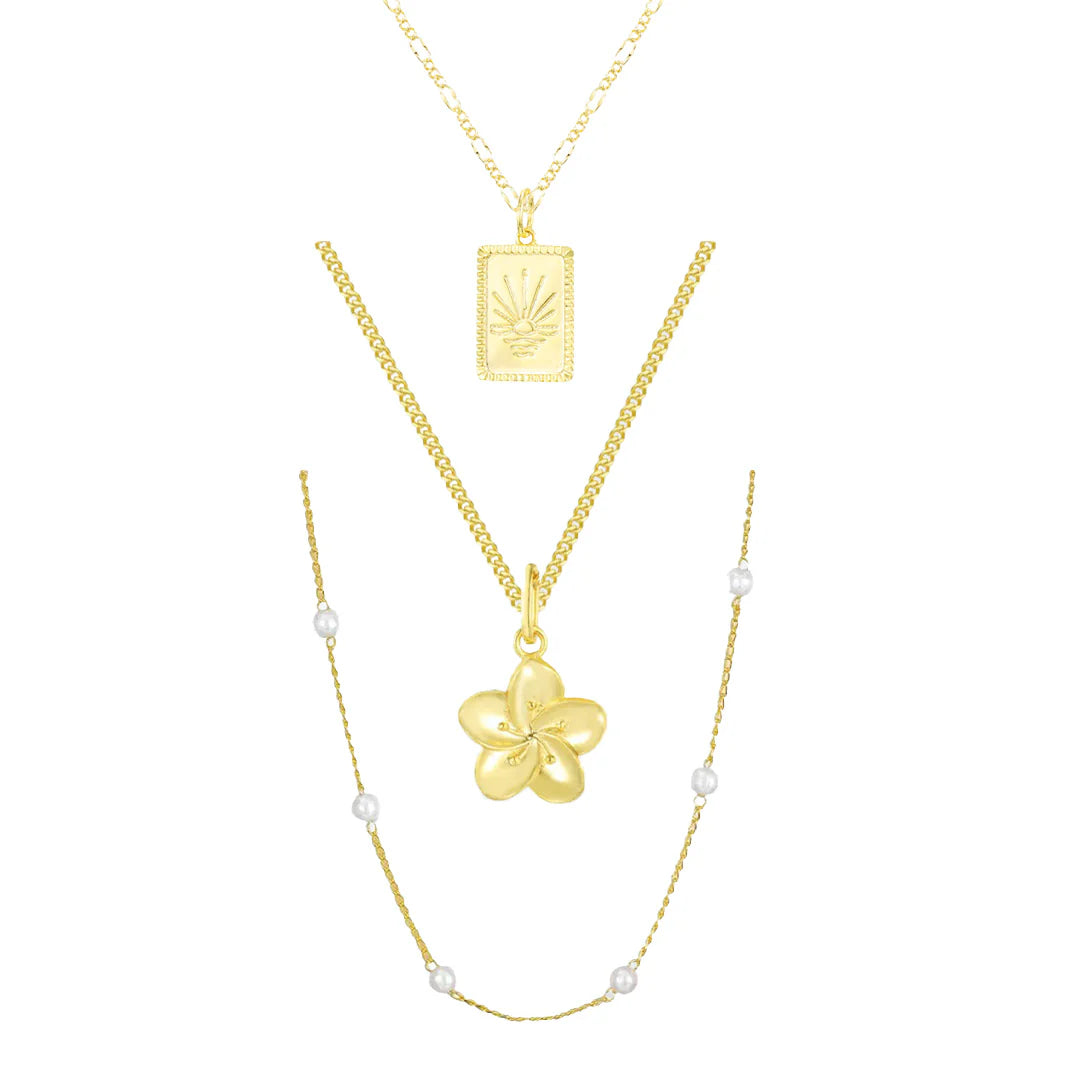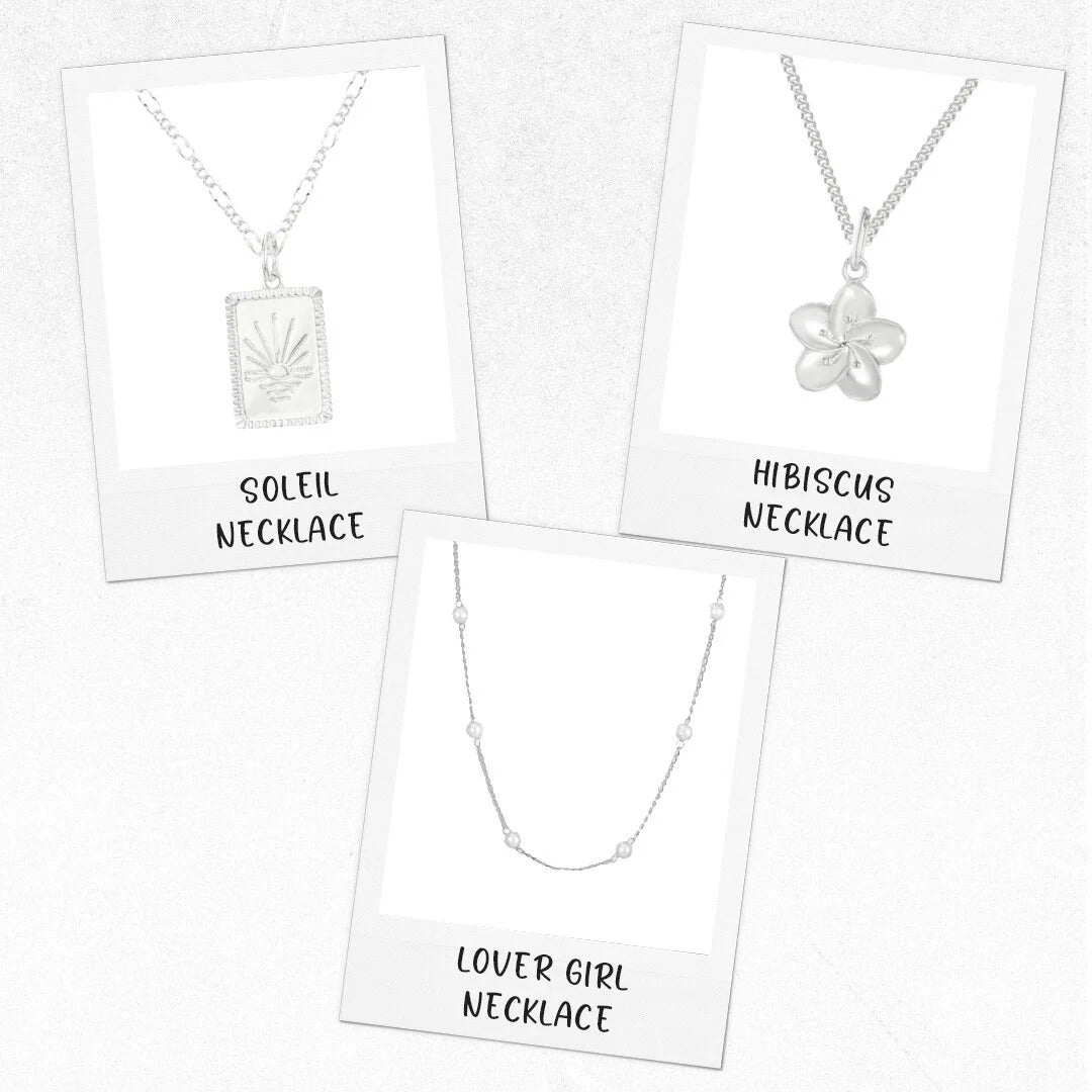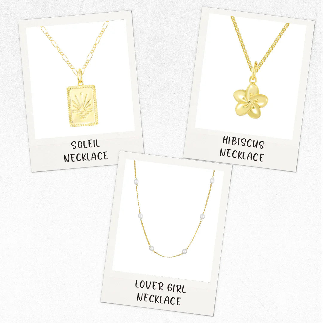This cute bundle includes three beautiful jewelry items - the Lover Girl Necklace, Hibiscus Necklace, and Soleil Necklace. Perfect for adding a delicate glow to any outfit.