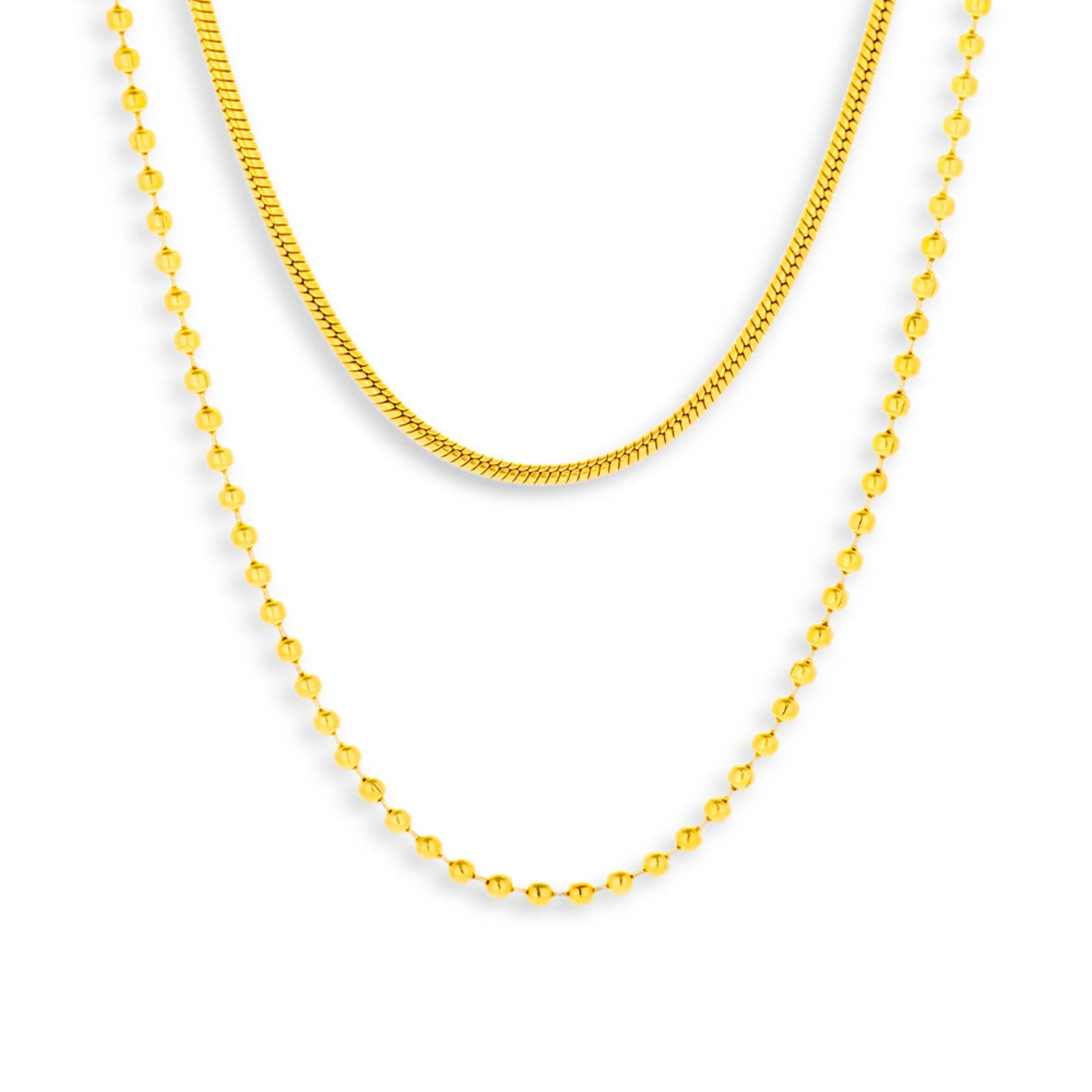 Make a sleek yet playful statement with this layered necklace featuring a smooth snake chain paired with a delicate beaded strand. The dual textures add dimension and shine, making it the perfect accessory for layering or wearing solo for an elevated everyday look.