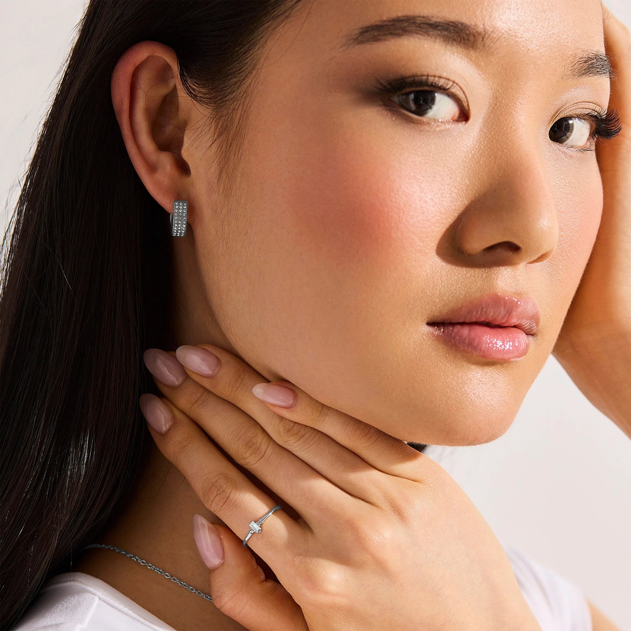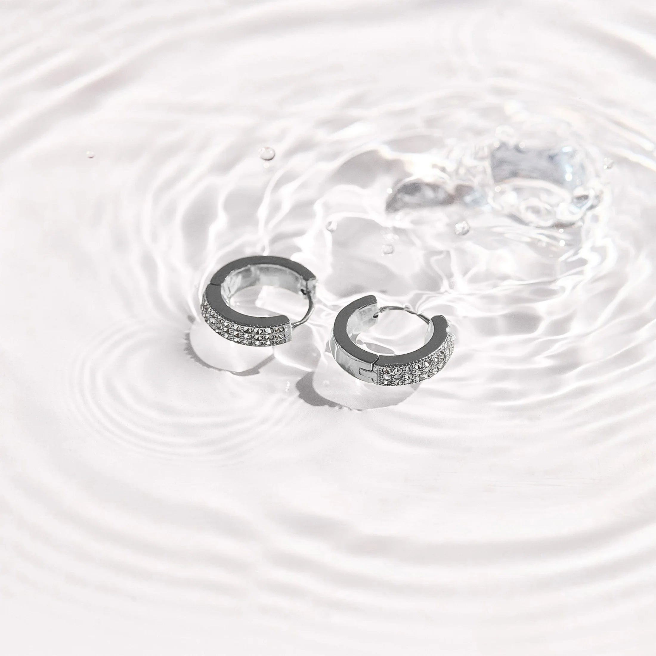 These pavé crystal huggie hoops are all about bold sparkle in a sleek, compact shape. Designed with three full rows of crystals on a chunky squared frame, they deliver shine from every angle. A statement piece that’s still small enough for everyday wear.