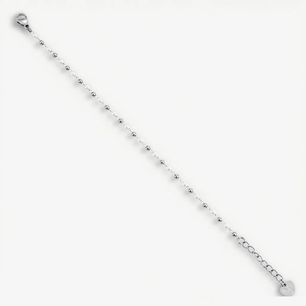 The Pearl Tone Bracelet is all about subtle shine. Featuring white and gold patterned beads on a dainty chain, this piece is delicate and ready to pair with any look.