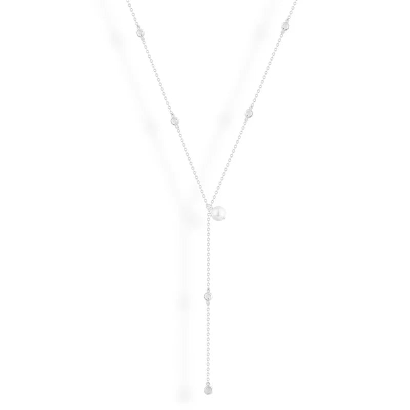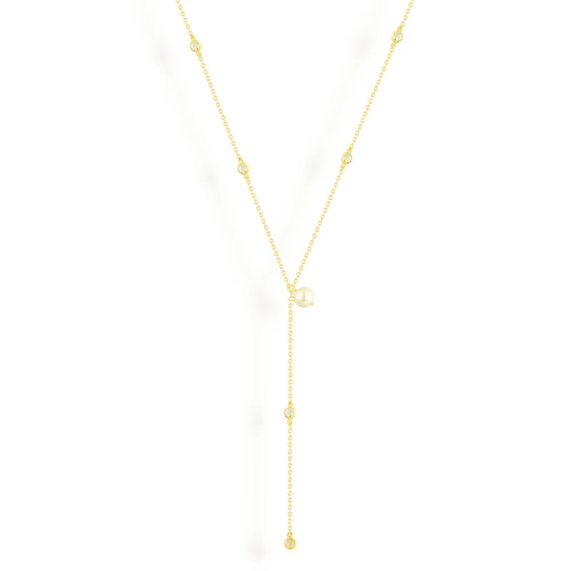 An elegant gold lariat necklace featuring delicate crystal accents and a single luminous pearl. Minimal yet sophisticated, this versatile piece adds effortless shine and grace to any look — perfect for layering or wearing solo for a chic statement.