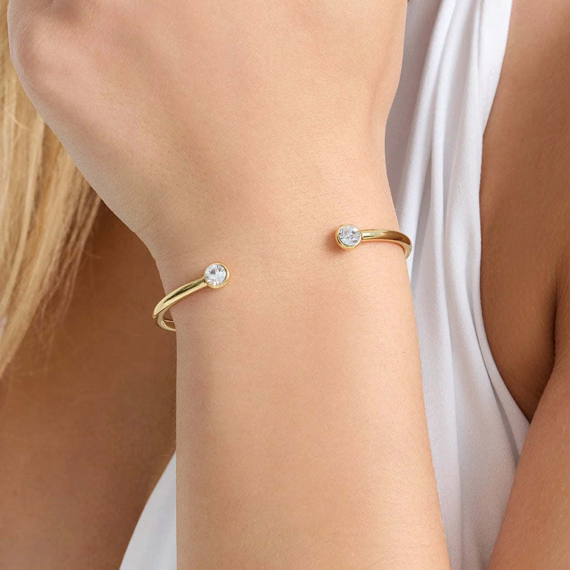 Elevate your style with the Serena Bangle! A simple, yet stunning bangle that features bezel set stones for a touch of elegance. Make a statement with this versatile accessory that seamlessly elevates any outfit.