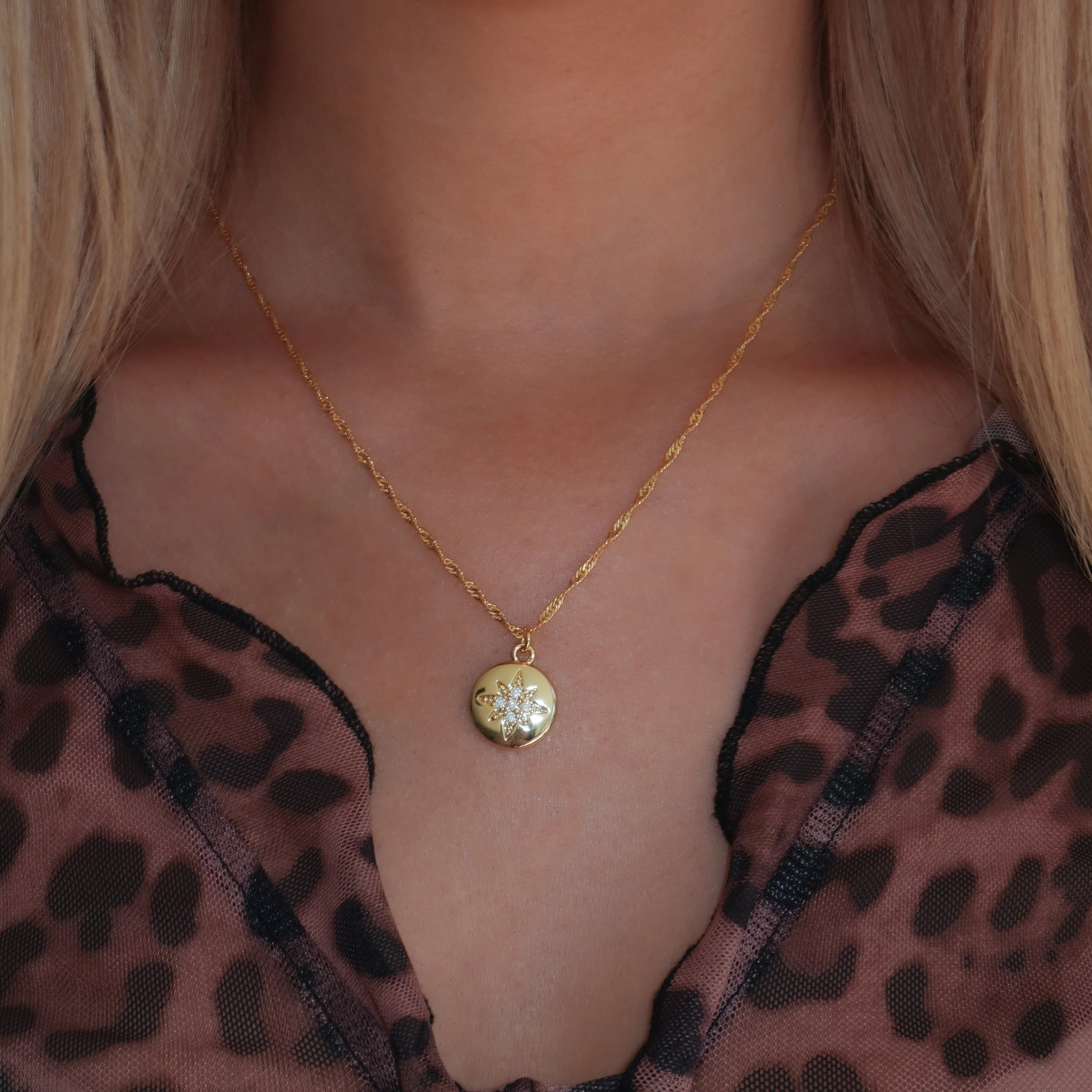 Shine bright like a star with our Silent Night Necklace. The round pendant features a bezelled north star, adding a touch of cuteness to any outfit. Bring joy and sparkle to your look with this charming necklace.