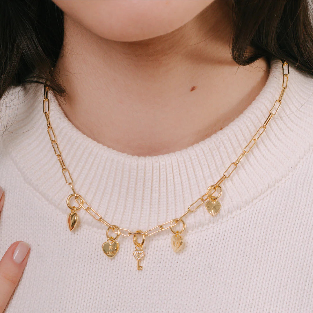 Unlock the key to your heart with our Wanna Be Yours Charm. This adorable charm features a heart-shaped key pendant adorned with sparkling pavé stones. Show off your love and add a touch of cuteness to any outfit with this charming accessory.